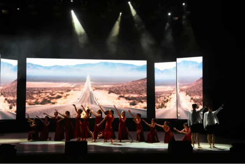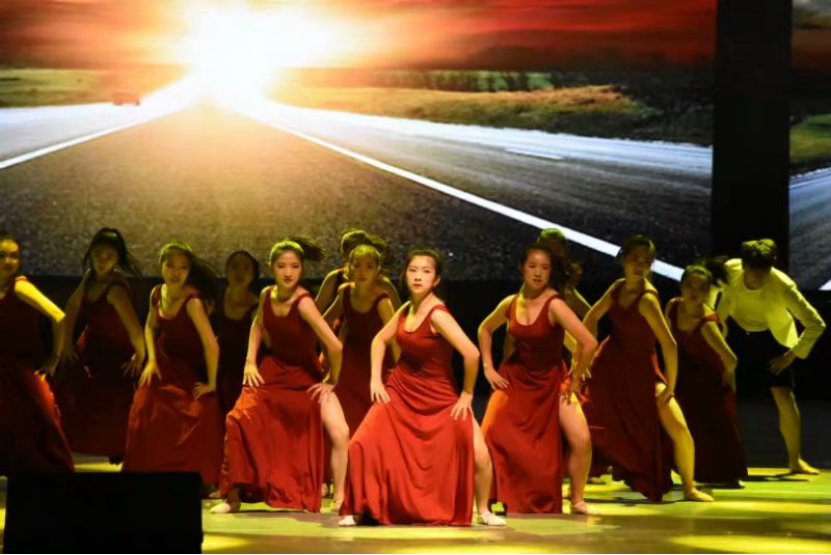 舞蹈的第二个主题是“筑路”。随着音乐的节奏逐渐加快,郭马杰和李凡龙两位同学在舞台的中央开始了原地奔跑的脚步,两侧的女生们缓缓而出,带着略沉重却充满力量的步伐,排列成一条直路的队伍,像是一个个寻找到方向的筑路人,开始了她们铺垫未来的征程。她们目光笃定,用力地抬起手臂,为从黑暗中冲出来的男生们开辟空间。紧接着,简单的队形变换过后,这条“人形”道路瞬间散开,形成了一条横跨舞台的长路,杨灿同学从路的一端冲出,与右侧的同学连成了一条接连的手臂反转波浪。音乐愈发激烈,逐渐到了舞蹈的高潮部分。同学们从一条长路的队伍中冲出,在舞台上点缀成点点散的队形,二胡声起,伴随着下腰、手臂翻转、低头抬头的舞蹈动作,舞台上的画面似充满了将要扑向观众席的力量。