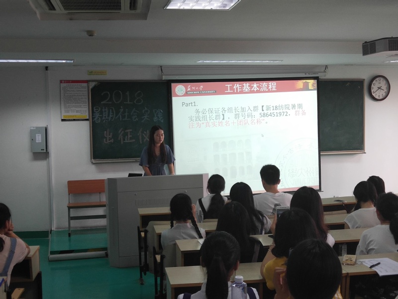 2018年6月29日,由苏州大学纺织与服装工程学院团委主办,纺织与服装工程学院学生科技协会承办的2018年暑期社会实践指导会议暨出征仪式在工科楼311顺利举行。本次出征仪式由刘莉主持并担任讲解员,学生办公室副主任赵伟老师作为嘉宾为一百多个实践小分队讲解了实践活动相关事项。