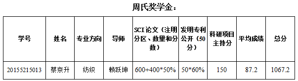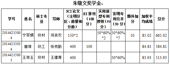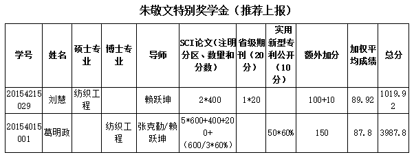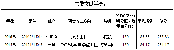 根据《苏州大学纺织与服装工程学院研究生奖助学金评定条例(试行稿)》,经纺织与服装工程学院奖助学金评审委员会讨论决定,以下同学获得2017年研究生奖助学金: