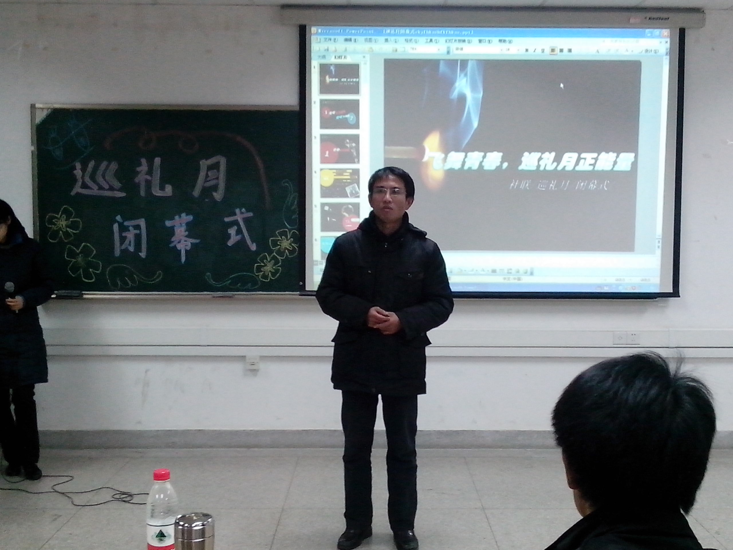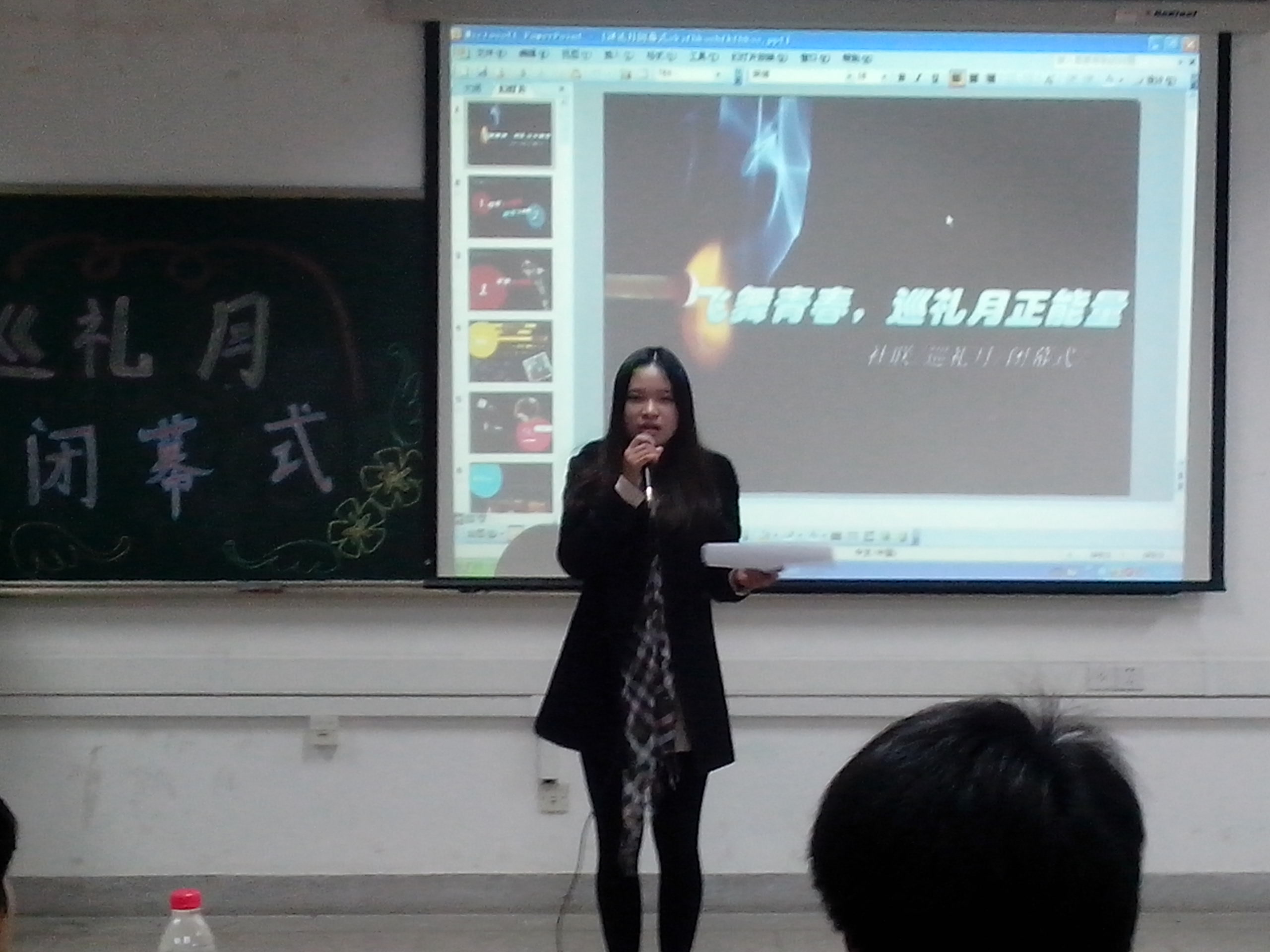 历时一个月的巡礼月,带给广大学生展示自我的舞台,也给大家留下了一段难忘的回忆,在告别之际,闭幕式给予巡礼月完美的谢幕,首先,通过一段ppt,回顾一下巡礼月的开端,通过ppt唤起我们共同经历的那段快乐时光,开幕式上的精彩歌舞,难以忘记的走秀。巡礼月中的各个活动,英语俱乐部的万圣节晚会,服饰面料协会的纽扣娃娃DIY,环保协会的递叶传情活动。在各个社团的活动中,展示出各社团的独特风采,通过各社团的活动综合表现,此次闭幕式评出了人气社团英语俱乐部、文明社团服饰面料协会、最优秀社团羽毛球协会。虽然闭幕式以回顾评比为主,但中间的节目依然精彩纷呈。一曲《海阔天空》唱出了大家的心声,活动模仿秀视频逗得大家笑声不断,相声《新生》展现出现在学生存在的问题,而最重要的部分要数王成奎老师,钟霞主席以及社联各部长们的发言,通过发言,我们得出无社团不大学的结论,懂得学习以及社团活动的重要性,有利于校园文化进一步发展。