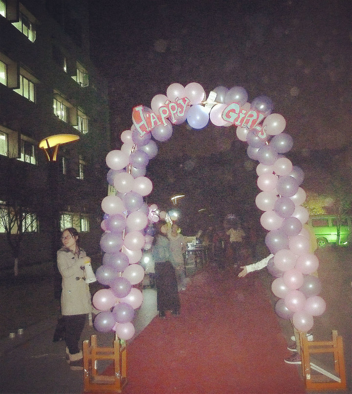 晚上8点半,在工科楼门前,“女生之夜”活动吸引了许多同学来参加。走出工科楼向左拐,踏上一条红地毯,穿过一个浪漫的气球门,是“女生之夜”的活动现场。开场活动是“好礼相送”,活动现场有一座七彩气球墙,每个气球里都有惊喜,捏破它就是兑奖券、糖果;继续往前走是“你猜我猜大家猜”,主持人在电脑屏幕上展示一个物品,然后大家猜物品的价格;接着是“维多利亚的秘密”,这里将展示最新的女生时尚讯息;然后是游戏“超级转转转”,游戏规则就是在规定的时间内谁转的圈数最少谁就是胜利者;接着往前走是游戏“谁是卧底”;继续往前走就是“小P老师”,视频里小P老师将教女生们怎么化妆。整个活动现场热闹非凡,同学们都在自己感兴趣的游戏里玩的不亦乐乎,有的在猜柚子茶的价格,有的在了解时尚资讯,有的在向小P老师学怎样化妆既美丽又大方,有的在数别人转了多少圈,有的在猜谁是卧底。