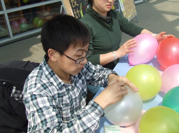第二个项目为“危险气球”,参赛选手用牙签在透明胶带上,再将牙签插入气球中,如果气球不爆的话就算一个气球成功,率先完成五个气球的获胜。这个游戏非常考验参赛选手手上的力度,插牙签时轻了,戳不破;重了,气球便嘭地一下炸掉了。平时毛手毛脚惯了的男生这个时候就有点吃亏啦,好不容易插进去了,一不小心气球就爆掉了,果然只有细心的女生能担此“重任”了。