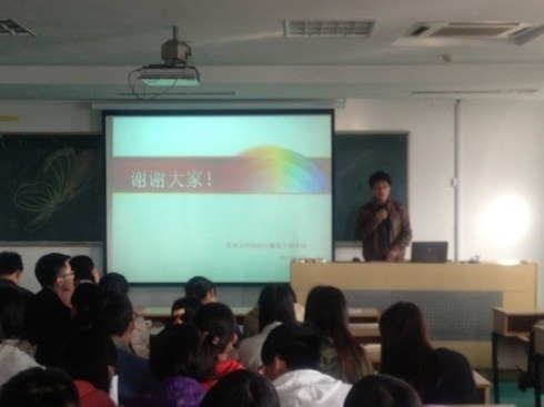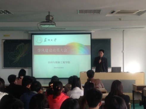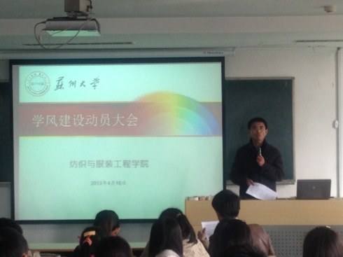 接下来,马老师公布了我院2012年优良学风班级评比结果,10-轻化班和11-纺织国际班获得了此项光荣称号。马老师向同学们详细介绍了评比细则。评比主要分为三个部分:班级的申报及自评,任课老师对班级的评价以及班级的ppt展示。在这次的优良学风班级评比中,每个班级都展现出他们各自的风采。马老师也希望,通过优良学风班级评比,纺织与服装工程学院也能更进一步,更上一层楼。