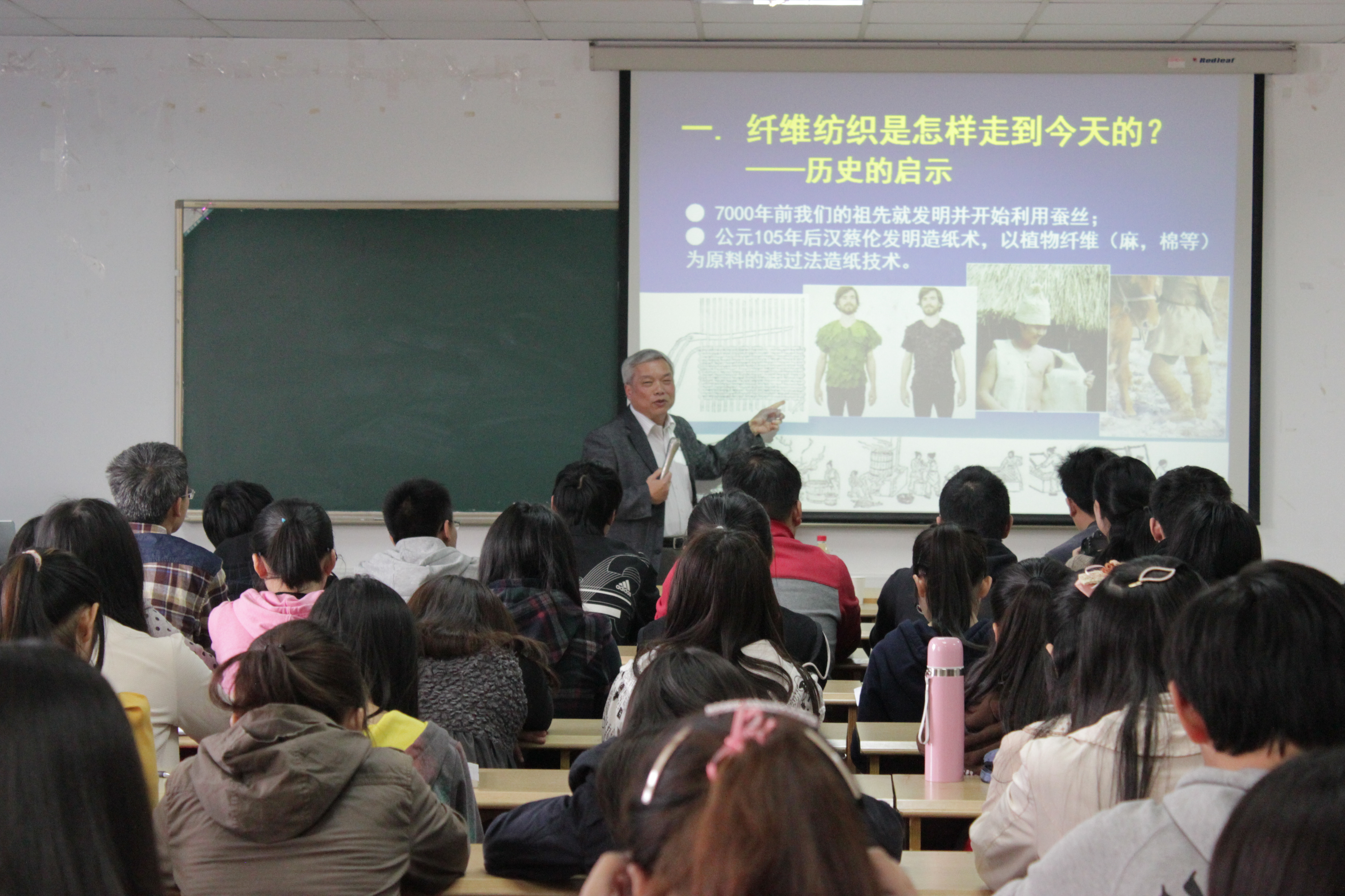 讲座中,白老师分五个篇章系统介绍了纺织材料的历史演变、生产现状以及应用前景。他以硝化人造丝的发明、树皮纤维服饰等历史启示为我们形象阐述纤维纺织是怎样走到今天的;他结合纤维学科教育与科研的使命,让我们领略纤维世界的无限空间;他还以蚕宝宝在常温常压、以水为溶剂便能吐丝等现象举例,感叹纤维科学的奥秘多多,鼓励我们追寻天作之妙的答案;白老师还向我们指明纺织发展的方向,即超常化和多样化的挑战;最后,白老师还以蚕丝生物材料的开发应用,为我们详细介绍了蚕丝材料多样化多功能的广阔应用前景。