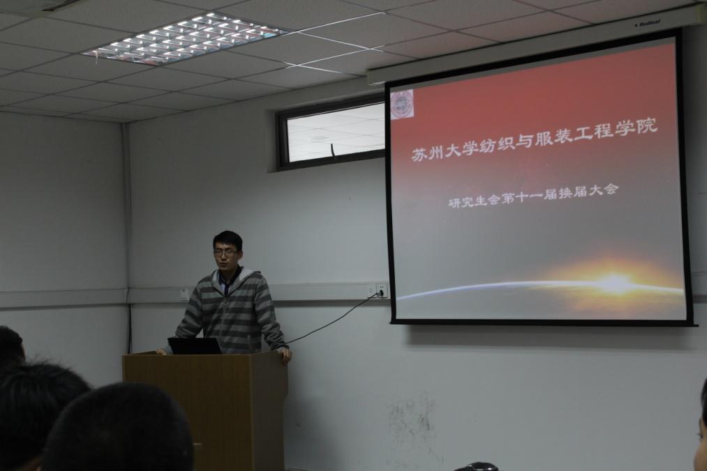 为保障纺织与服装工程学院研究生会工作的连续性,促进新老研会成员的工作交接,为纺院研会注入新生力量,也为了更好地发挥研会的自主职能,大力推进校园文化建设,纺织与服装工程学院研究生会于3月30日下午2:00在独墅湖校区908幢楼召开第十一届换届大会,大会由新任副主席孙晓旭同学主持。出席本次会议的有纺织与服装工程学院党委书记孙庆民老师、研究生教育管理科科长严明老师、纺织与服装工程学院研究生辅导员蒋闰蕾老师,以及第十届院研会优秀学生干部和第十一届院研会成员。