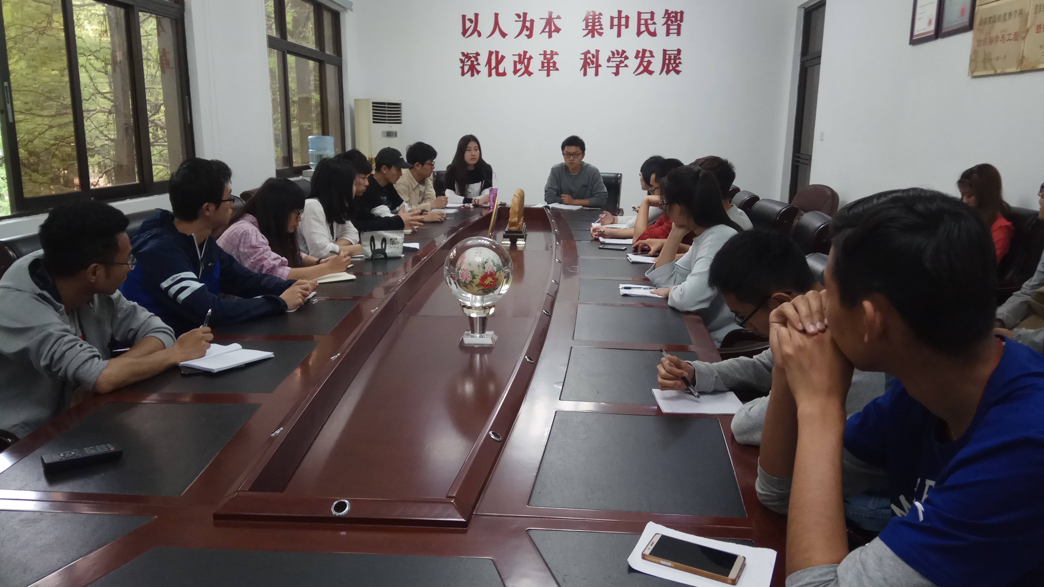 2017年4月19日下午15:30,纺织与服装工程学院学生会体育部全体成员以及学院各年级各班班长、体委、学生代表在丝韵楼团委会议室召开第九届师生阳光体育节民主讨论总结会,学院团委老师赵伟、孙晓旭主持本次会议。