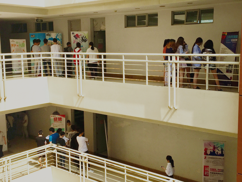 由苏州大学纺织与服装工程学院主办的苏州大学2018届纺织服装类实习生专场双选会于6月2日下午在苏州大学北校区工科楼举行。本次双选会共有17家公司,60余个工作岗位招募2018届实习生。招聘会当天,学生们仔细阅读意向公司的工作简章与要求,并根据自己的专业及、兴趣进行面试,工科楼里随处可见为面试做准备学生。