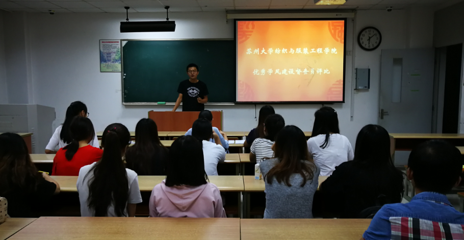2017年9月8日晚18时,在苏州大学北校区工科楼206教室,举行纺织与服装工程学院2016—2017学年第二学期优秀学风建设督察员评比活动。学院团委老师赵伟、优秀学生代表吴玉婷、狄思嘉、毕明以及2016级学风建设督察员出席本次活动。