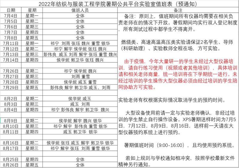 2022年纺织与服装工程学院暑期公共平台实验室值班表