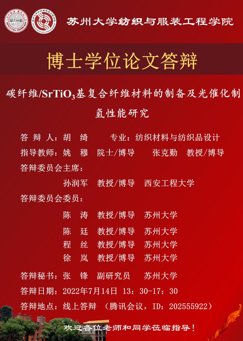 纺织与服装工程学院胡绮、朱彩虹博士论文答辩公告