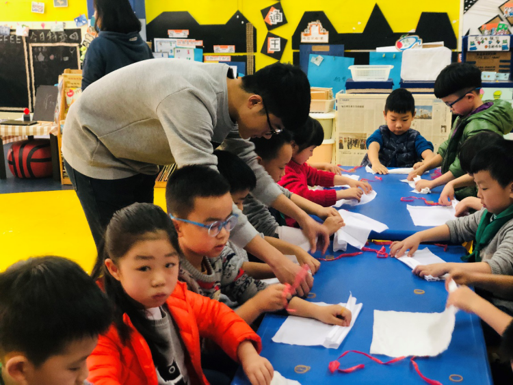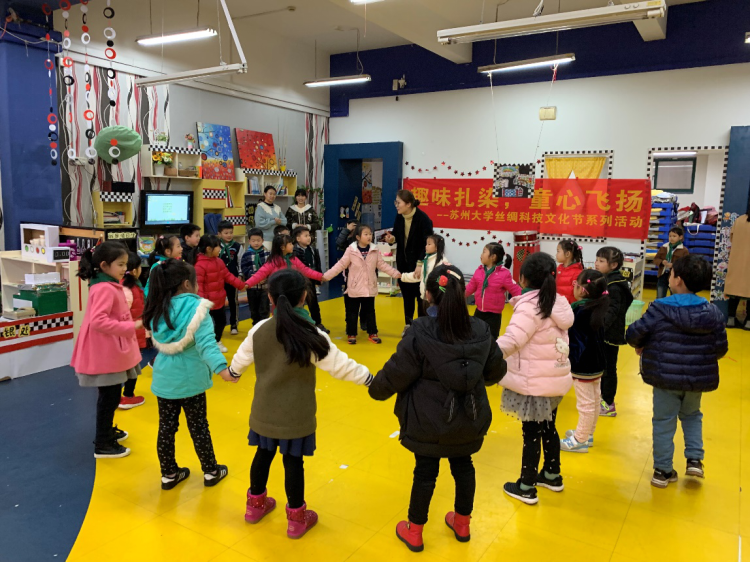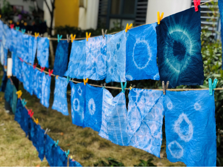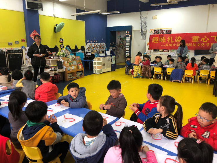 扎染是中国传统的手工染色技术之一。它是通过纱、线、绳等工具,对织物进行扎、缝、缚、缀、夹等多种形式组合后进行染色。印染时晕色丰富,变化自然,趣味无穷,这种独特的艺术效果,是机械印染工艺难以达到的。2019年3月20日下午,纺织与服装工程学院辅导员季彦斐,与8名志愿者一起来到苏州东方岚谷幼儿园,为幼儿园的小朋友们带来一堂精彩的非遗传承“扎染”课。