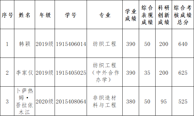 根据《关于做好2022年本科生国家奖学金有关工作的通知》(学字﹝2022﹞53号)通知精神,经个人申请,奖学金审核小组审核,奖学金评审工作组审议,评定出2022年纺织与服装工程学院本科生国家奖学金获奖者3名,现将名单予以公示,具体信息如下: